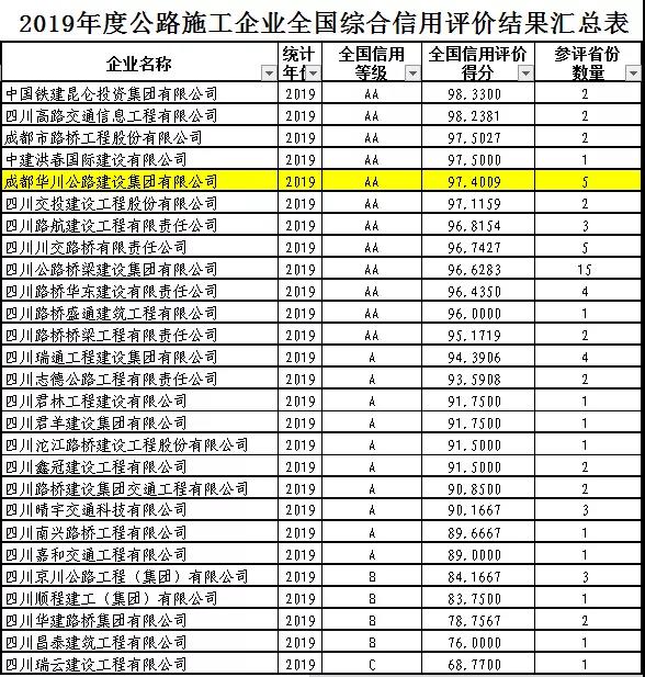交通運輸部于2020年7月23日對2019年度公路施工企業全國綜合信用評價結果進行公示,集團再次榮獲 “AA”級。