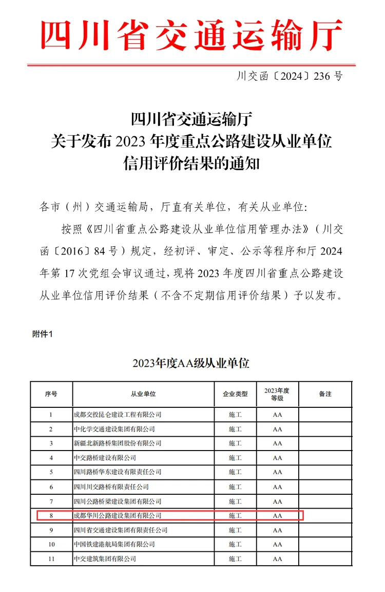 6月4日,四川省交通運輸廳公布了2023年度重點公路建設從業單位信用評價結果,集團再次榮獲最高等級“AA級”,也是自2015年以來連續9年獲得該最高等級評級。