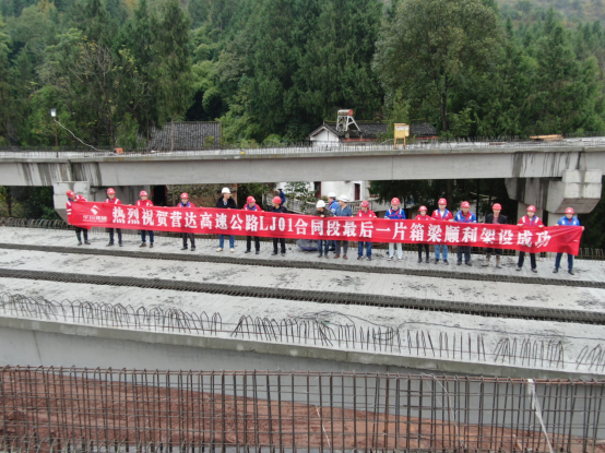 11月24日10時18分,隨著新店樞紐互通G匝道橋最后一片小箱梁被吊裝設備穩穩安放在最后一跨墩柱上,現場慶祝的煙花頓時直沖云霄,鞭炮聲、歡呼聲、吶喊聲響成一片。對于參與新店樞紐互通施工的每一個參建者來說,這是一個激動人心的時刻。新店樞紐互通最后一片箱梁順利架設成功,標志著整個新店樞紐互通主體結構施工全面完工,提前6天完成了營達公司下達的目標任務。