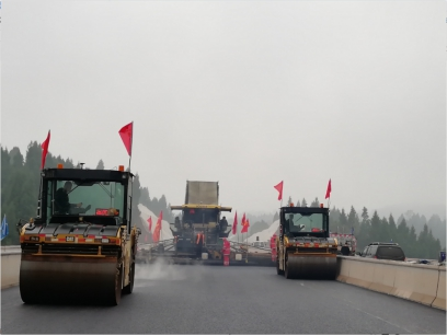 觀施工現場,華川旗幟高高飄揚,迎著微風,伴著小雨,1臺攤鋪機、5臺壓路機、15臺運輸車相互密切配合,攤鋪、碾壓機器發出的聲響,奏出了一曲鏗鏘有力的“施工進行曲”。現場負責人及時查看攤鋪厚度,確保厚度在合理范圍內,技術員實時查看瀝青攤鋪溫度,項目部領導駐現場指導,經過各級人員的共同努力,精心組織、標準化,文明化施工,攜手完成了本次試驗段鋪筑工作。