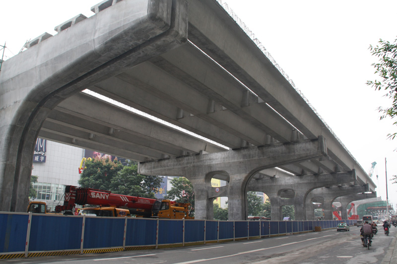 二環(huán)路東段改造工程路面施工,施工時間為2012年5月到2013年7月,投資為4.97億元,該工程北起二環(huán)路北府河橋東側,向東經商貿大道、火車北站、雙橋子立交,南止于二環(huán)路南府河橋東側,全長13.1公里。為“連續(xù)高架快速路+地面城市主干路”,底層道路按照雙向6-8車道建設,高架快速車道為雙向6車道,路面面積80.43萬m³。主要工程內容包括:瀝青砼路面鋪裝(含噴砂打毛和防水層)、底層道路路面施工(含底基層、基層、面層、路緣石等附屬工程)